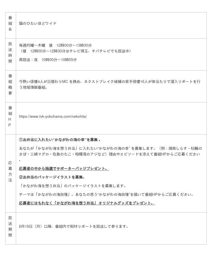 一般社団法人海と日本プロジェクトinかながわは、tvk(テレビ神奈川)にて放送中の地域情報番組「猫のひたいほどワイド」(月曜~木曜ひる12時生放送中)と連携し、「かながわ海を想う弁当」を開発します。この番組企画は、次世代へ豊かで美しい海を引き継ぐために、海を介して人と人とがつながる“日本財団「海と日本プロジェクト」”の一環です。