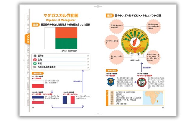 国旗・国章・域旗・域章が現在のデザインに至る変遷も紹介しているので、その国や地域の歴史が見える! 国旗・国章にまつわる興味深いエピソードを紹介したコラムも5本収録。