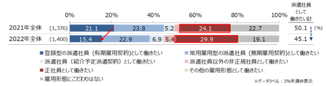 長引くコロナ禍と物価上昇により、賃金待遇の向上と雇用の安定を求め、派遣社員の正社員就業意向が高まっていると考えられる。