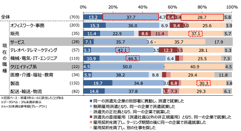 職種別にみると、無期雇用派遣が多いのは[機械・電気・IT・エンジニア][テレオペ・テレマーケティング]が4割超となった。一方で、契約を満了し別の仕事を探した人が多い職種は[販売][製造]でそれぞれ3割を超えた。【図4】
