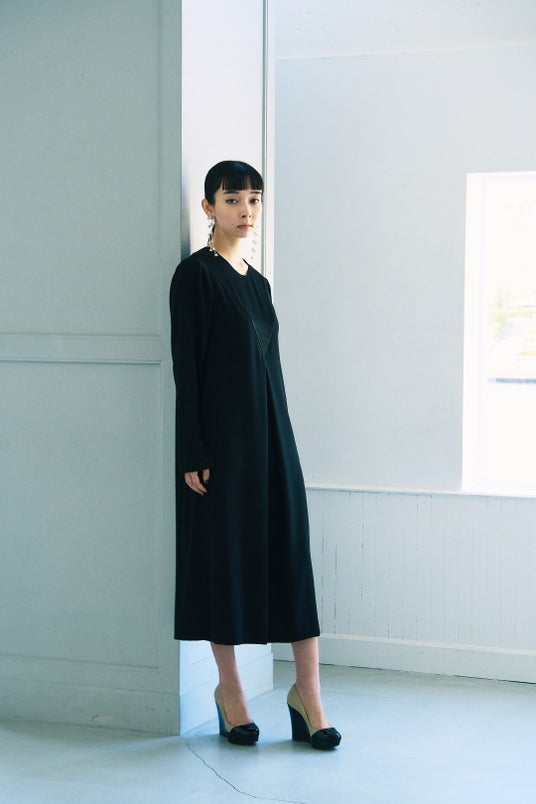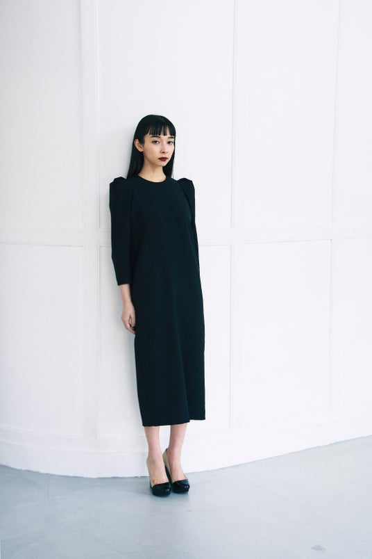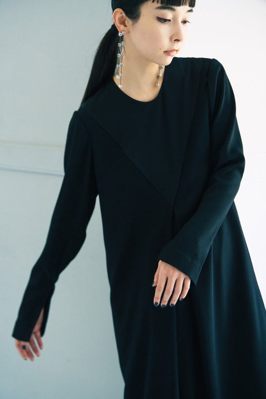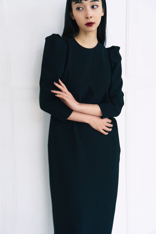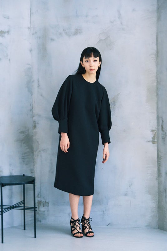 ミニマルなボディのブラックドレスは、モードなボリュームスリーブがアクセント。