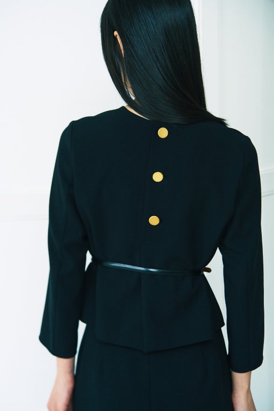 ブラウスは後ろ身頃の開きに金ボタンを使用してアクセントを。
