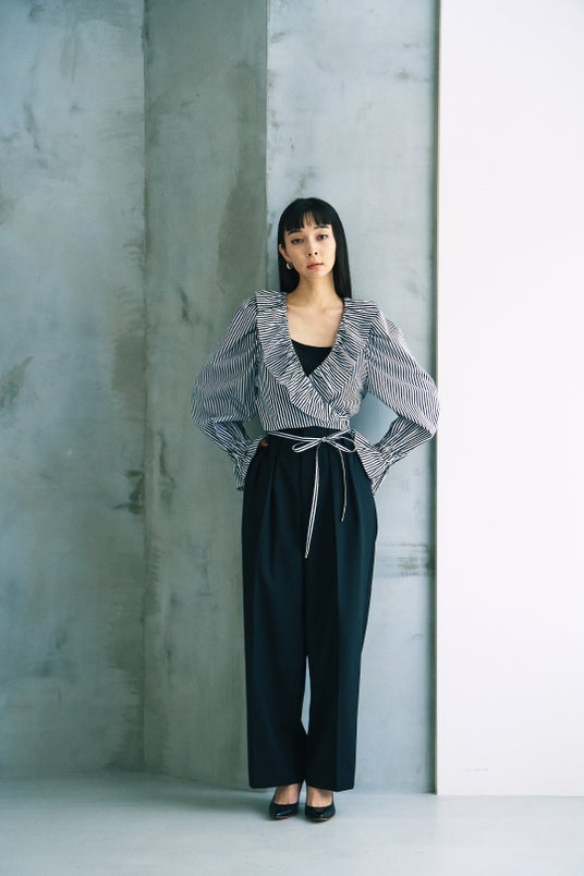 襟元と袖のフリルが可愛いカシュクールブラウスは、今年らしく短丈に。