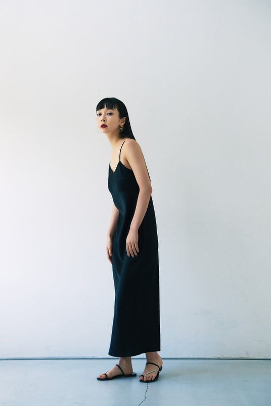 光沢感のある柔らかな手触りのサテン生地を使用した、シンプルなキャミソールドレス。