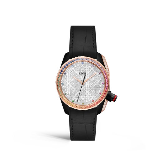 ホワイトゴールド製のダイアルにはパヴェダイヤモンドが配され、「カナージュ」モチーフが精巧に描かれており、ピンクゴールド製のベゼルにはサファイア、アメシスト、ペリドット、ツァボライト、トルマリン、ルビーが交互にあしらわれ、唯一無二のジュエリータイムピースとしての煌めきに溢れています。また魅惑的なニュアンスとコントラストの組み合わせは、秒針とブレスレットに配された深みのあるブラックカラーによって、より一層際立ちます。ミックス&マッチをお楽しみいただけるよう同タイムピースのために特別にデザインされたインターチェンジャブル式のストラップは、ブラックアリゲーター製と「マクロカナージュ」モチーフを施したイエロー、グリーン、ブルー、レッド、ブラック、計5色のラバーストラップを取り揃え、シースルーケースバック越しに自動巻きムーブメントを楽しめる直径38mmの同タイムピースは、ユニセックスにも纏っていただけます。