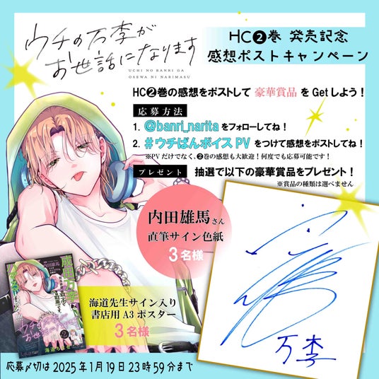 2.ハッシュタグ「#ウチばんボイスPV」をつけて2巻やボイスPVの感想をポストして応募完了!