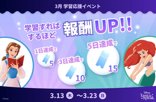 株式会社アルク(東京都品川区 代表取締役社長:天野 智之、以下アルク)は、ウォルト・ディズニー・ジャパン株式会社監修の英語・英会話アプリ「ディズニー ファンタスピーク」において、学習を応援するイベントの開催と、新しいコンテンツをリリースいたしました。