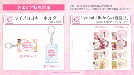 VIPエリアチケットには昼夜各公演のLyrical Lilyからの招待状とライブロゴキーホルダーが、Sエリアチケットには昼夜各公演のLyrical Lilyからの招待状が付属いたします。