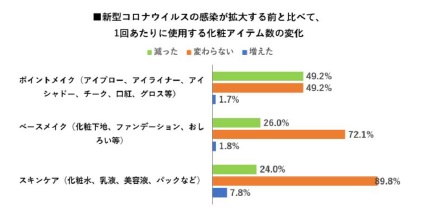資生堂は夏のマスク着用に関するインターネット調査※を行ったところ、新型コロナウイルスの感染が拡大する前と比べて、49.2%の方が1回あたりに使用するポイントメイクのアイテム数を減らしていることがわかりました。なかでも、一番多く減らしているアイテムは、口紅・リップグロスで87.6%、次いでほおべに・チークが64.8%となっており、マスクで見えないことや、メイクの付着が理由であると考察できます。