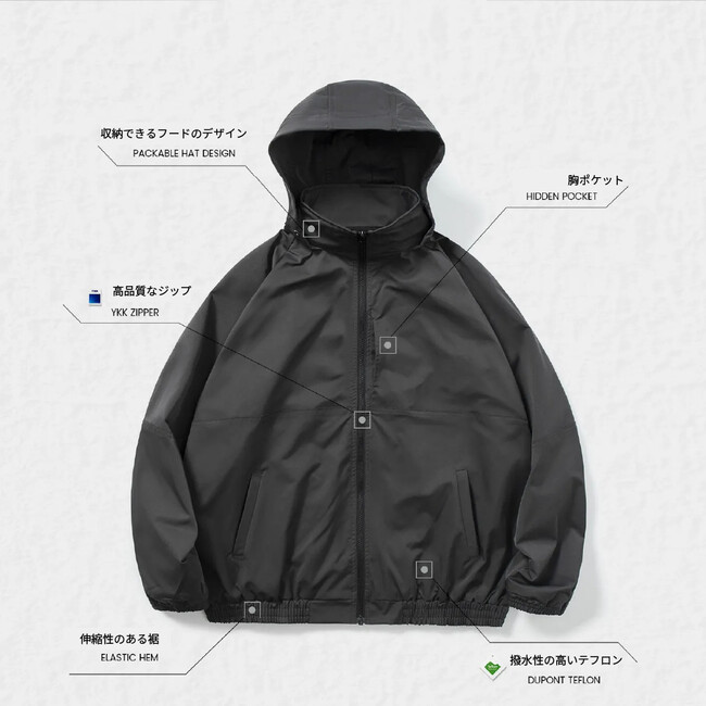 撥水性の高いテフロン素材採用、収納式フードや充実したポケットなど機能的で高品質なディテール