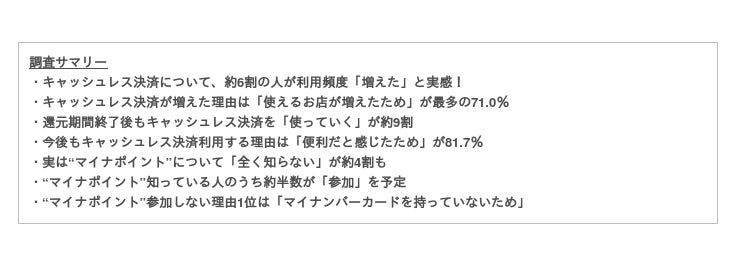 その他「消費者還元事業の期間が終わっても各社のキャンペーンがあると予想されるため」「衛生面においてキャッシュレス決済の方が安全だと感じるため」「現金を持たない習慣がついてしまったため」と回答した人がそれぞれ約3割という結果になりました。