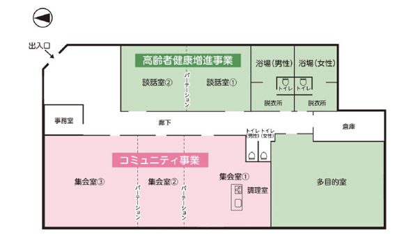 地域交流の促進(コミュニティ事業)や、高齢者の社会参加・生きがいづくり・健康づくりの場の提供(高齢者健康増進事業)を行う施設です。