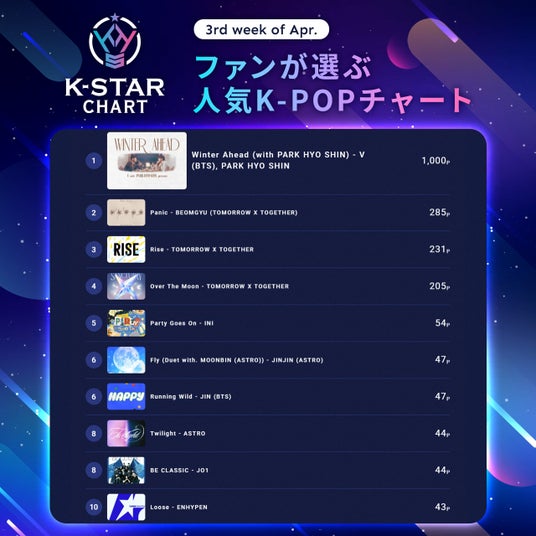 2位はASTROの「Twilight」、3位はTOMORROW X TOGETHERの「Over The Moon」という結果となり、『K-STAR CHART presents POP-K TOP10 Friday』4月18日(金)放送回において発表されました。