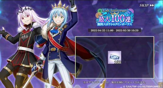 株式会社バンダイナムコエンターテインメントより配信している『転生したらスライムだった件 魔王と竜の建国譚』は、本日3.5周年を迎えました。これを記念して、35大還元キャンペーンを開催します