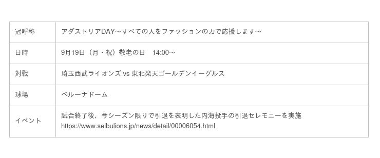 「Play fashion!」をミッションに掲げ、”グッドコミュニティ共創カンパニー”を目指す株式会社アダストリア(本部:東京都渋谷区渋谷2-21-1、代表取締役社長:木村 治)は、9月19日(月・祝)にベルーナドームで行われる埼玉西武ライオンズ対東北楽天ゴールデンイーグルス戦において、ゲームスポンサーを務めることをお知らせいたします。ゲーム当日は、ファンにはうれしい景品が当たる抽選会を実施。1日を通じて、ファンの皆さまに楽しんでいただけるイベントを開催し、ファッションの力でゲームを盛り上げます。