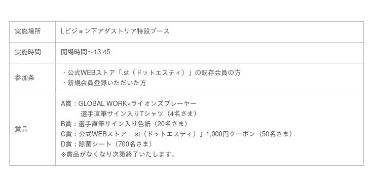 9月19日(月・祝)にベルーナドームで行われる埼玉西武ライオンズ対東北楽天ゴールデンイーグルス戦では、ゲームスポンサーを務め、当日はアダストリア特設ブースを出展。選手直筆サインが入ったGLOBAL WORKとライオンズの若獅子4人のコラボグッズが当たる抽選会や、昨年当社が制作した、球場スタッフが着ているユニフォーム(https://globalwork.jp/seibu_lions/)の展示を行います。