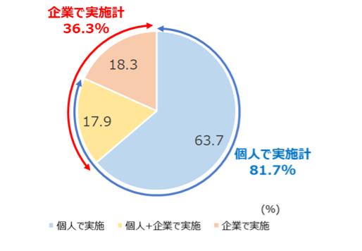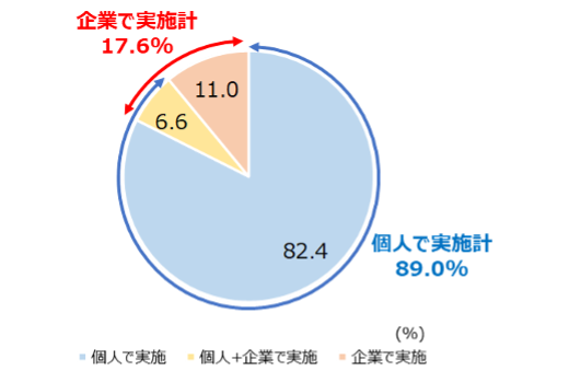 リスキリング実施者のうち個人で行っている人は約9割に上るが、企業での実施に期待する割合も約4割【図6、7、8】