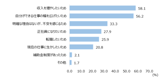 今後最も希望する働き方は「正社員」が33.4%で、雇用の安定性を重要視する人が増加傾向。リスキリングを必要だと感じる人は6割弱で、理由は収入を増やすためが半数以上。