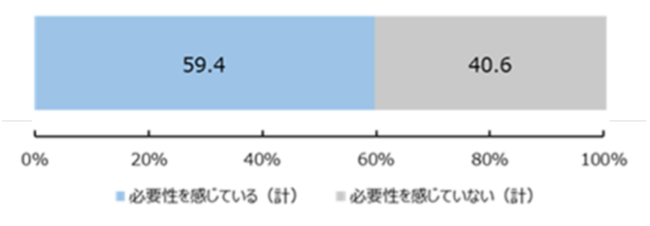 リスキリング(学び直し)を必要だと感じている人は59.4%と約6割に上った。必要だと感じている理由は「収入を増やすため(58.1%)」が最も高く、次いで「自分ができる仕事の幅を広げたいため(56.2%)」となった。一方で、必要と感じない理由では「負担する費用が重いため(36.1%)」「どのようなことを学び直したら仕事に活かせるか分からないため(35.4%)」が多く、現状に満足はしていないが、リスキリングに費用をかける金銭的な余裕がなかったり、そもそも自身が何をすべきかが分からないといった理由が挙がった。【図3、4、5】