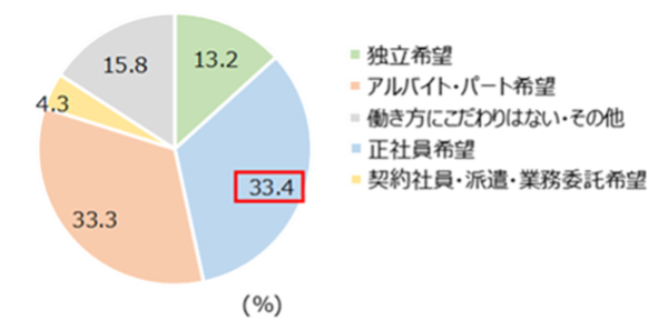 今後最も希望する働き方を聞いたところ、「正社員希望」が33.4%で最も多く、次いで引き続き「アルバイト・パート希望」の割合は、33.3%となった。