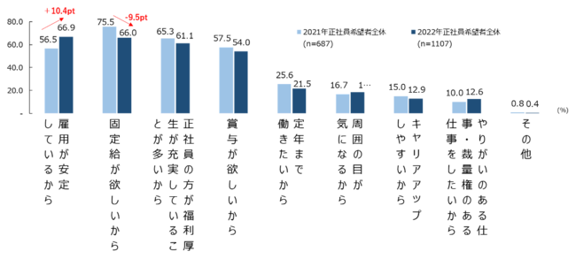 正社員を希望する理由を聞くと、「雇用が安定しているから」が前年比10.4pt増となり66.9%で最も多く、次いで「固定給が欲しいから」が前年比9.5pt減で66.0%となった。雇用の安定性を重視し、正社員を希望する人が増加していることがうかがえる。【図1、2】