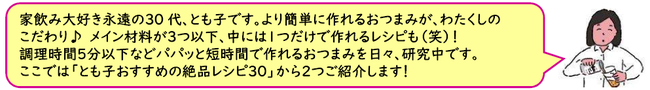 本誌は、アサヒビールのWebサイトで連載中の“家飲み大好き、とも子”が綴るコラム「家のみ酒とも日記」をまとめたレシピ本です。豆腐や野菜、缶詰などの身近な材料を、「切って混ぜるだけ」「のせるだけ」「レンチンするだけ」で、超簡単にできるおつまみを中心に掲載しています。メイン材料1つだけで作れるおつまみから、お店みたいなおしゃれなおつまみまで、お酒を引き立ててくれる151品を紹介! クリスマスや年末年始など、これから増える家飲み時間がさらに盛り上がること間違いなしの簡単おつまみレシピ集です。