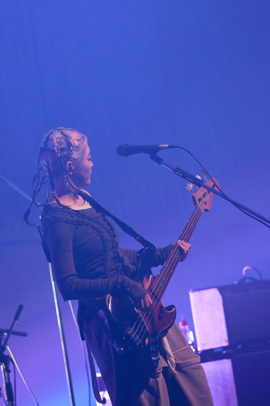 クリス・ペプラーに呼び込まれてステージに静かに登場した塩塚モエカ(Vo, Gt)と河西ゆりか(Ba)、サポートドラマーのYUNAの3人は、<朝へゆく船はいま動き出す>という歌詞から始まる「hopi」で厳かにライブの幕を開ける。豊潤なバンドサウンドと美しいコーラスが広がり、場内はコンサートホールへとあっという間に様変わり。さらにメンバーも表情を緩ませた「あいまいでいいよ」「深呼吸」を続け、一気に羊文学の世界へ誘った。