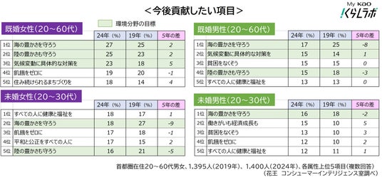 SDGsでは、貧困や飢餓、教育、気候変動など社会・経済・環境の側面から17の開発目標が設定されています。 そのうち貢献したい項目の上位は、「海や陸の豊かさを守る」「気候変動への対策」といった環境分野。特に既婚男女(20~60代)は関心が高く、未婚男女(20~30代)になると、貧困や飢餓、平等などの項目も入ってきます。