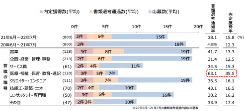 また、内定獲得率をみると、全体では15.8%(前年比:+3.5pt)となり、前年より応募求人を慎重に検討し、効率よく内定獲得に繋げている様子がうかがえる。職種別に書類選考通過率、内定獲得率をみると、「医療・福祉・保育・教育・通訳」がいずれも高く、コロナ禍による人手不足や、同業種・同職種間での転職活動が多いことが一因と考えられる。【図2】