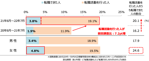21年6月から22年7月に、転職活動を行った人は19.1%(前年比:+7.2pt)、男女別では男性18.9%、女性19.5%となり、前年よりも正社員の転職活動が活発化していることがわかる。また、転職活動を行った人のうち、転職できた人の割合は20.1%(前年比:+3.9pt)で、男性が17.9%、女性が24.6%と、女性が男性を6.7pt上回った。