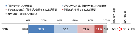 今後また転職する場合、「働きやすいこと」「働きがいが持てること」のどちらが重要か聞いたところ、「働きやすいこと」が63.0%、「働きがいを持てること」が33.2%で、働きやすさが大きく上回った。【図4】