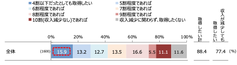 男性育休の取得による収入の許容できる減少割合をみると、収入が通常時の「8割程度であれば」が16.6%で最も高く、次いで「4割以下だったとしても取得したい(取得してほしい)と思う」が15.9%となった。