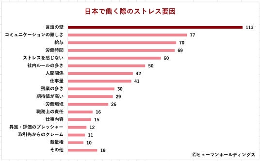 「日本で働く際のストレス要因」(複数回答可)では、「言語の壁」が最も多い結果となりました。「言語の壁」が要因のひとつとも考えられる「コミュニケーションの難しさ」が2番目に挙げられています。また、「給与」「労働時間」と続き、労働時間やそれへの対価に不満を感じている状況が見受けられます。