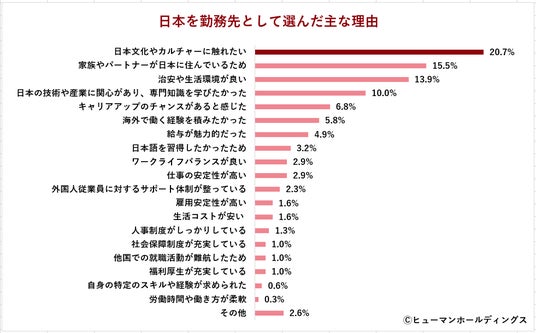 「日本を勤務先として選んだ主な理由」については、「日本文化やカルチャーに触れたい(20.7%)」が最も多く、「家族やパートナーが日本に住んでいるため(15.5%)」「治安や生活環境が良い(13.9%)」が続く結果となりました。勤務先として日本を選択するにあたり、生活する上での希望を重視している様子が伺えます。