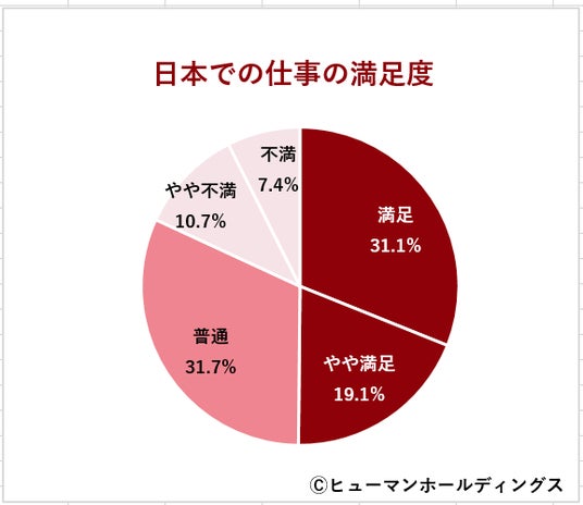 「日本での仕事の満足度」について質問したところ、「満足(31.1%)」「やや満足(19.1%)」と50.2%が満足しており、不満に感じているのは18.1%(「不満」「やや不満」の合計値)という結果になりました。