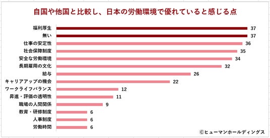 ●「日本の労働環境で優れている」と感じるのは「福利厚生」と「無い」が同率1位。日本企業の福利厚生は世界水準と比較しても充実していることが推察される