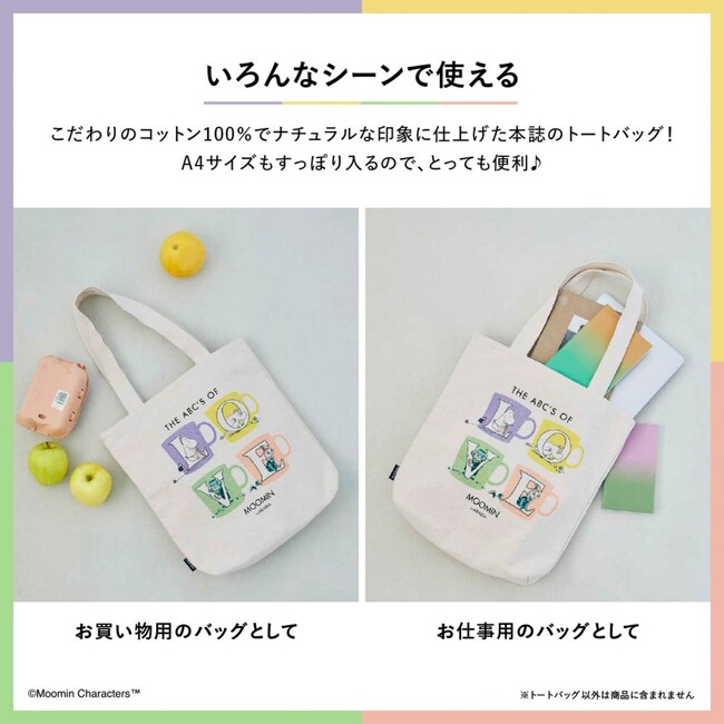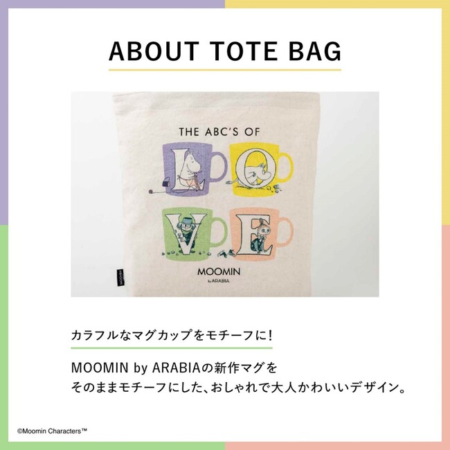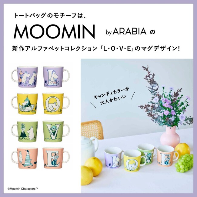 デザインのモチーフはこの冬登場した「MOOMIN by ARABIA」の新作デザイン、「アルファベットコレクション」。その記念すべき第1弾としてリリースされた「L」「O」「V」「E」のマグカップは、4つ揃えると「LOVE」になるというもの。アルファベットとともにムーミンママ、ムーミン、ロッドユール、ミムラねえさんがそれぞれ描かれた、キャンディカラーの大人かわいいマグデザインが、素敵なトートバッグになりました。