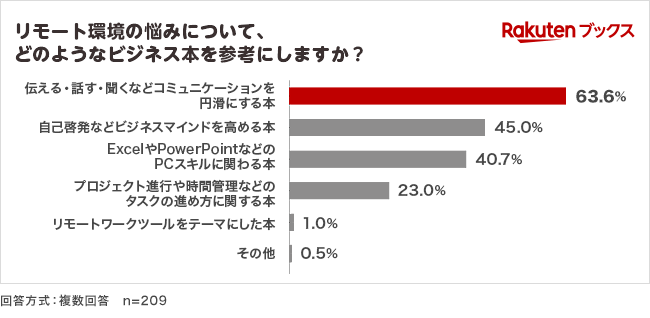 ●リモート環境下における悩みについて、参考にするビジネス本は「伝える・話す・聞くなどコミュニケーションを円滑にする本」(63.6%)、「自己啓発などビジネスマインドを高める本」(45.0%)、「ExcelやPowerPointなどのPCスキルに関わる本」(40.7%)が上位(図5)