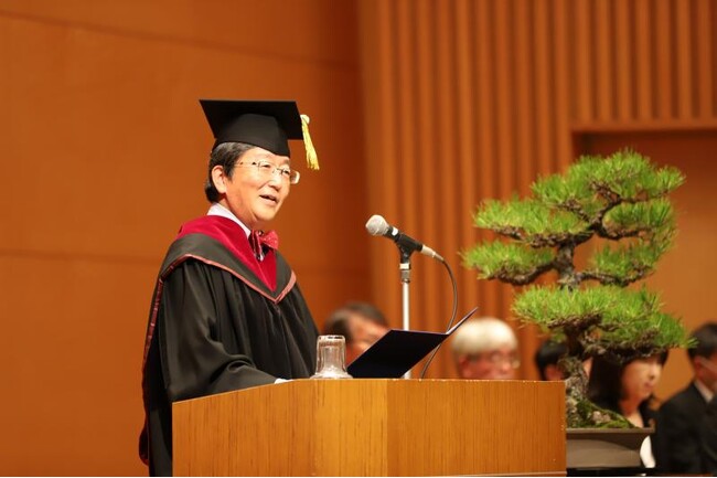 那須学長は英語で式辞を述べ、「FUEKI-RYUKO(不易流行)」と「OKADAI-LOVE(岡大愛)」の2つの言葉をテイクホームメッセージとして紹介。「We hope that you will be proud of what you have learned at OKADAI and what you have accomplished in obtaining your respective degrees. We wish you a lifetime of success, health, and happiness in your future with OKADAI-LOVE .(岡大で学んだこと、各々の学位を取得したことを誇りに思っていただきたいです。岡大愛を抱く皆さんの未来が、ご活躍、ご健康、そしてご多幸に溢れることを祈っています。)」と卒業生にメッセージを送りました。