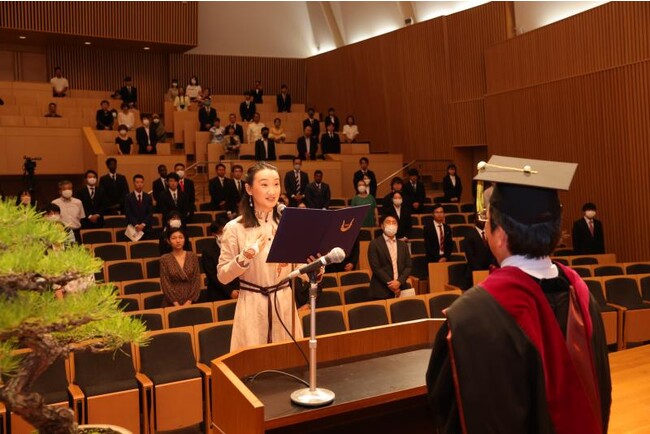 卒業生・修了生を代表して、大学院環境生命科学研究科のザオ マオシャンさんが「Our journey to Japan amidst the COVID-19 pandemic has been transformative. Immersed in diverse cultures, Okayama University molded us into proud graduates. We're grateful to our Senseis for their guidance. Despite challenges, we pursued our Ph.D. Leaving comfort zones and facing hurdles, we proved that borders can't limit knowledge, resilience, or dreams. What we love most about Okayama University is its beautiful campus, outstanding academic environment, and quality exchange programs.(COVID-19の大流行により、私たちの日本への旅路は大きな影響を受けました。岡山大学は私たちを多様な文化に触れさせることで、誇り高き卒業生へと成長させてくれました。指導してくださった先生方に感謝しています。様々な困難にもかかわらず、私たちは博士号を取得することができました。私たちは快適な場所を離れ、障壁に立ち向かうことで、国境が知識、再起力、夢を制限することはできないことを証明しました。私たちは岡山大学の美しいキャンパス、優れた教育環境、質の高い留学プログラムを愛しています。)」と、答辞を述べました。