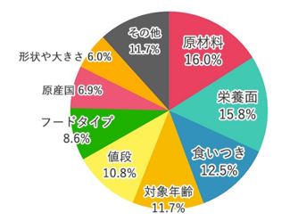 A.原材料 16.0%、栄養面 15.8%、くいつき 12.5%、対象年齢 11.7%、値段 10.8%、フードタイプ 8.6%、原産国 6.9%、フードの形状や大きさ 6.0%、その他 11.7%
