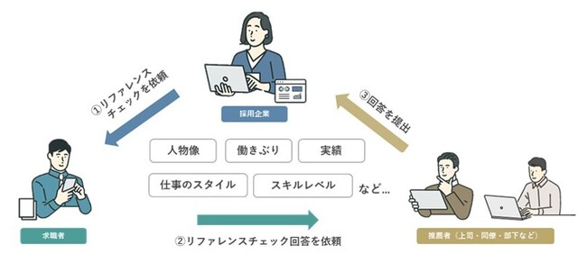 「リファレンスチェック」とは、書類や面接だけでは分からない採用候補者の情報を、一緒に働いたことのある第三者(現職・前職の職場の上司や同僚など)から取得し、マッチング精度の向上や入社後の育成に活用することです。海外では多くの企業が実施しており、主に採用候補者から推薦された2~3人の推薦者から働きぶりや・経歴、スキルなどの情報を取得します。最近では、電話による確認だけではなく、オンラインのみで完結するリファレンスチェックサービスも増加しています。