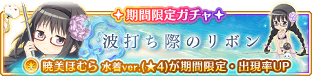 『期間限定ガチャ 波打ち際のリボン』では、魔法少女「暁美ほむら 水着ver.(CV.斎藤千和)」をはじめ、メモリア「上から下まで」「水着に着替えて」「ふたりだけの海と空」が期間限定で登場いたしました。