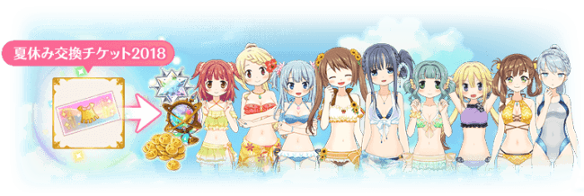 「夏休み交換チケット2018」は期間限定ショップで、ホーム画面用のオリジナルボイスが付いた魔法少女の衣装「水着」やレインボーオーブなどのアイテムと交換することができます。