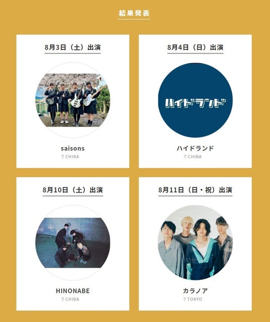 インディーズおよび新人アーティストの音楽活動支援を行う「Eggs」を運営している株式会社エッグス(本社:東京都渋谷区、代表取締役:柴崎栄太郎、以下「エッグス」)では、2024年8月3日(土)・4日(日)/10日(土)・11日(日・祝)・12日(月・振休)の5日間、千葉市蘇我スポーツ公園で開催される「ROCK IN JAPAN FESTIVAL 2024」のオープニングアクトとしての出演権をかけたオーディション「ROAD TO ROCK IN JAPAN FES. CHIBA 2024」の参加者を募集し、saisons、ハイドランド、HINONABE、カラノアの4組が出演権を獲得しました。