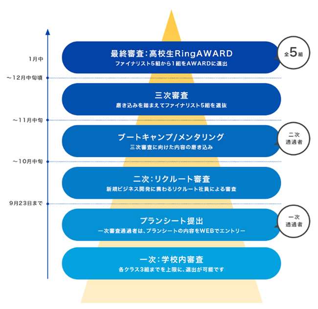 学校単位での参加で、学校内選抜を勝ち上がった約500案件のビジネスプランをリクルート社員が審査します。書類審査を通過した案件は、プランのアイデアをブラッシュアップするための講座やリクルートの事業開発経験者による個別のメンタリングを実施。次の動画審査を通過したチームは、2023年1月の「高校生Ring AWARD」にてプレゼンを実施いただき、優勝、準優勝が決まります。