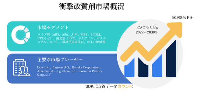 SDKI Inc.は、「グローバル衝撃改質剤市場ー予測2022ー2030年」新レポートを 2022年01月11日に発刊しました。この調査には、衝撃改質剤市場の成長に必要な統計的および分析的アプローチが含まれています。レポートで提供される主要な産業の洞察は、市場の既存のシナリオに関する読者に市場の概要についてのより良いアイデアを提供します。さらに、レポートには、市場の成長に関連する現在および将来の市場動向に関する詳細な議論が含まれています。