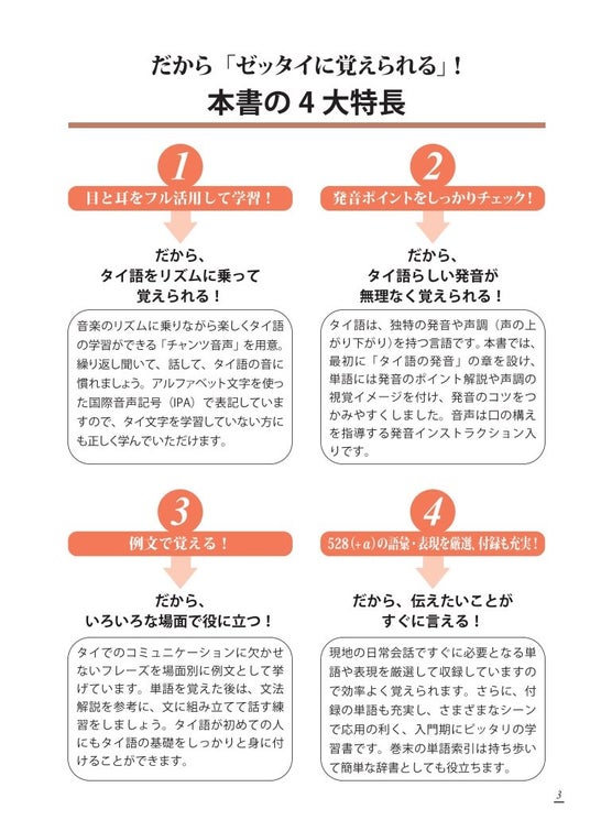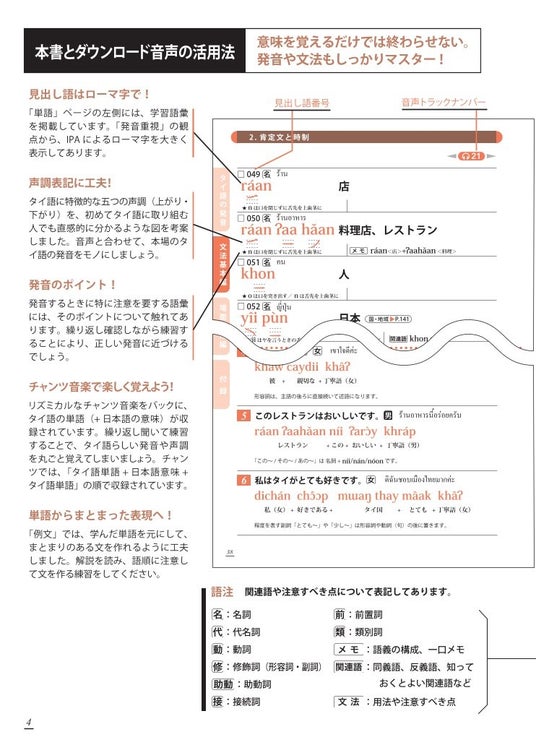 タイ語は、独特の発音や声調(声の上がり・下がり)を持つ言語です。本書では、単語には発音のポイント解説や声調の視覚イメージを付け、発音のコツをつかみやすくしました。口の構えに気を付けながら、一つ一つの音を丁寧に練習しましょう。