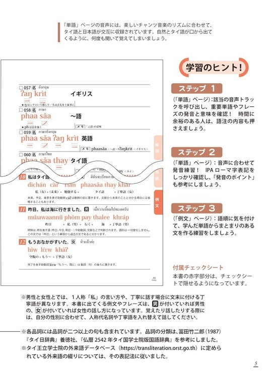 音楽のリズムに乗りながら楽しくタイ語の学習ができる「チャンツ音声」を用意。繰り返し聞いて、話して、タイ語の音に慣れましょう。アルファベット文字を使った国際音声記号(IPA)で表記していますので、タイ文字を学習していない方にも正しく学んでいただけます。
