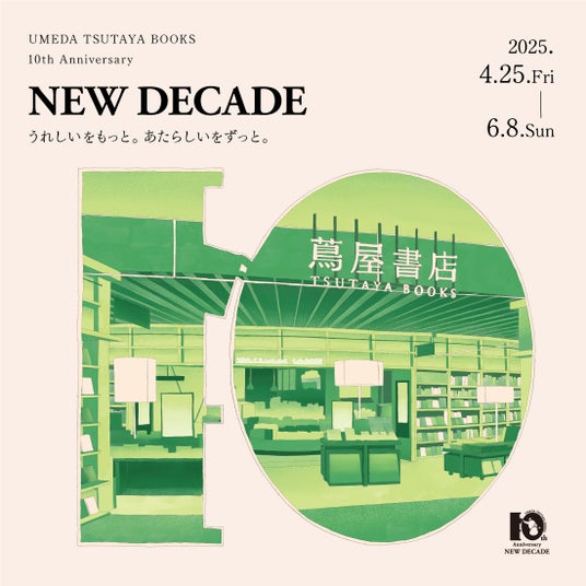 梅田 蔦屋書店(大阪府大阪市)は、オープン10周年を記念して、全館フェア「NEW DECADE ~うれしいをもっと。あたらしいをずっと。~」を2025年4月25日(金)から6月8日(日)まで開催します。この10年、ご愛顧いただいたお客様に心からの感謝を込めて、コンシェルジュによるフェアやイベント、スペシャルアイテムの販売、豪華景品が当たる抽選会など、10の企画をご用意します。新たな10年に向かう梅田 蔦屋書店をどうぞお楽しみください。